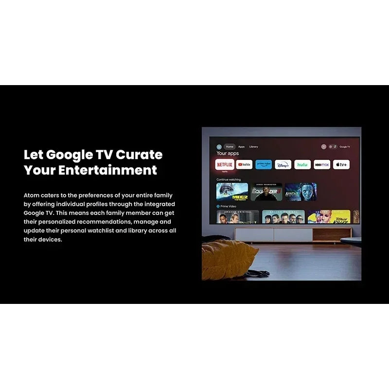 - Support de contenus 4K en décodage via Google TV ou source externe