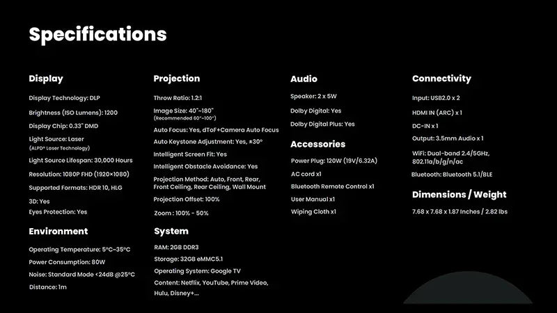 - Taille d’écran recommandée : de 40 à 120 pouces selon la pièce