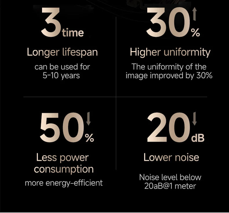 Les vidéoprojecteurs laser ont une durée de vie moyenne de 20 000 à 30 000 heures. C’est l’un des systèmes les plus durables, sans besoin de remplacer une lampe.